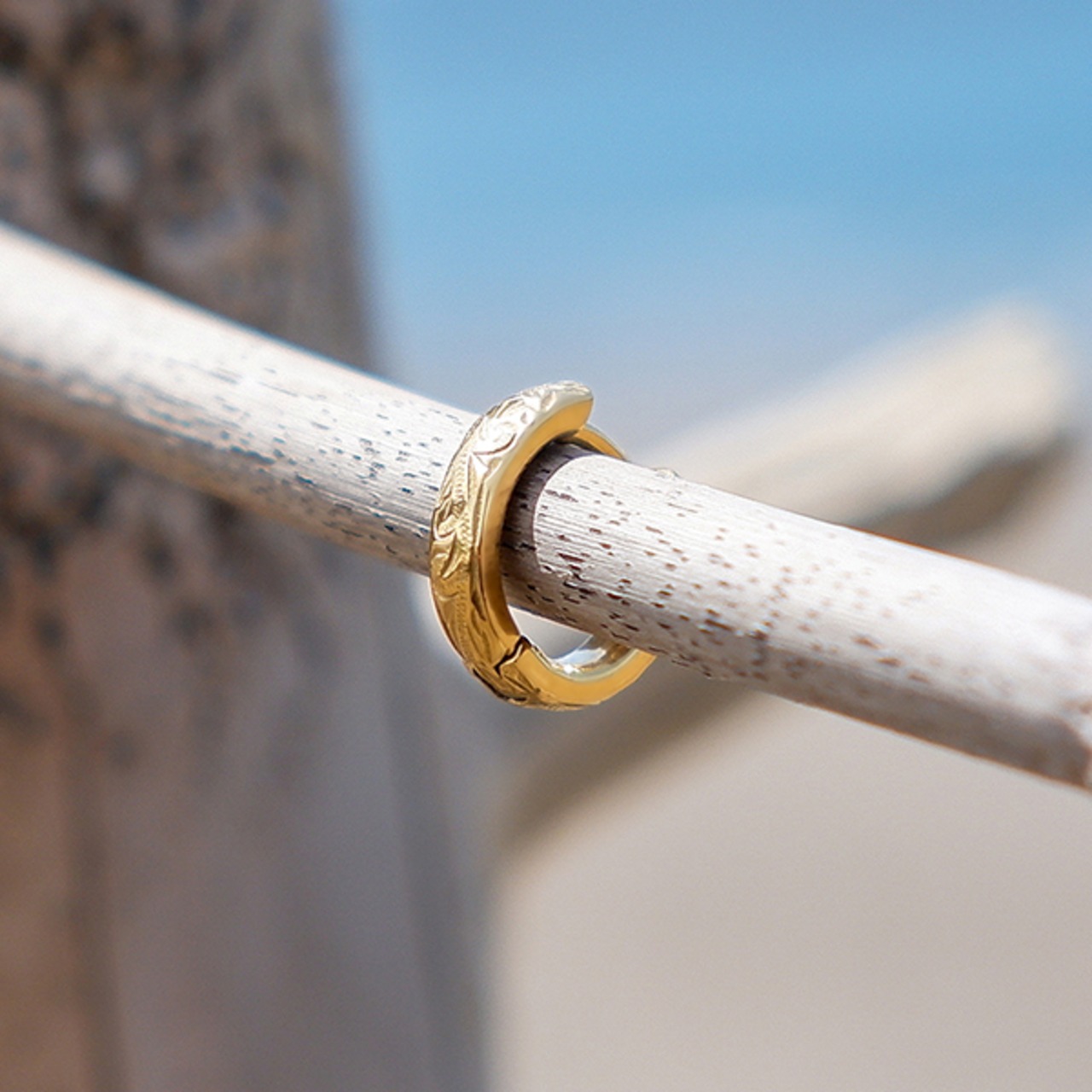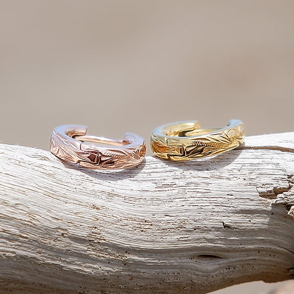 ハワイでは愛する人から想いを込めてハワイアンジュエリーを贈る習慣があります。 職人技の光る彫でハワイアンモチーフを描いた、ミニフープピアスです。 ステンレスならではの質感と艶感で丸みのある甲丸ラインに沿って 繊細で細やかなスクロール柄が全体に描かれています。 丸みのあるトップが光りを返し陰影のある表情が 耳元でアクセントになり大人らしい程ネイティブなスタイルの完成です。