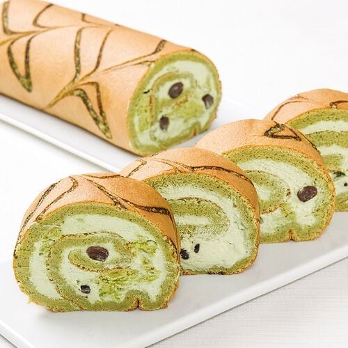 【抹茶香るロール】宇治産の抹茶を惜しみなく使用し、サクサクとしたクッキーのような食感の「抹茶ガレット」と、風味を損なわないようあえて甘さ控えめの「抹茶クリーム」を、もちもち食感の生地で巻きあげました。丸ごと1本どこを食べても濃厚な抹茶風味が楽しめる、和風ロールケーキです。