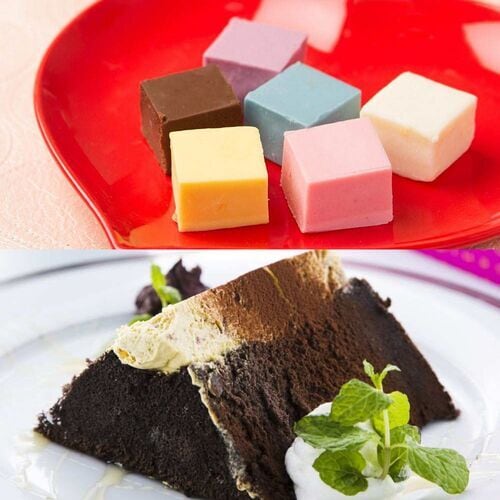 【RNY カラフルショコラ】和素材の寒天を使用した、生チョコよりも滑らかな口どけのフレーバーショコラ。色とりどりの宝石のようなチョコレートは、6種類それぞれ違うフレーバーが目を引きます。大きさは食べやすい2cm角。