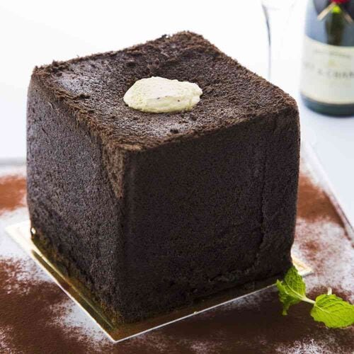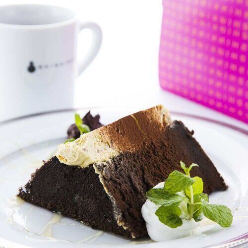【ガレ・シャルモン・シャンティーニュ】栗、ココア生地、マロンクリームの見事な融合を果たしたシフォンケーキ。ふわふわもっちりの食感を大切にするため、餅粉を入れた特殊な技法に渋皮栗を散らし、じっくりと焼き上げたココア生地。中央には粒栗入り特製マロンクリームクリームをぎっしり詰めました。