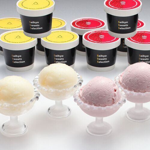 新潟の特産品の一つにあげられる西洋梨「ル レクチエ」を使用したなめらかな食感で香り高く仕上げたシャーベット、新潟県産のいちご(越後姫)を相性の良い練乳と混ぜ、素材の良さを生かした甘くて、コクのあるアイスクリームの嬉しい2種詰合せです。