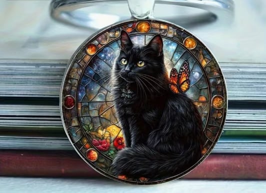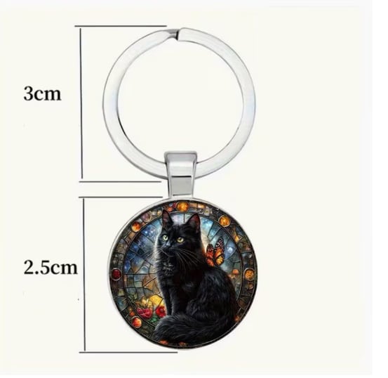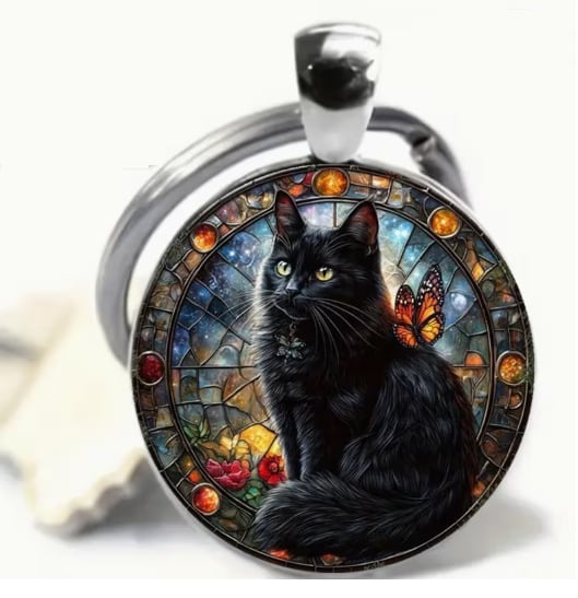 ステンドガラスのクロネコのキーリング