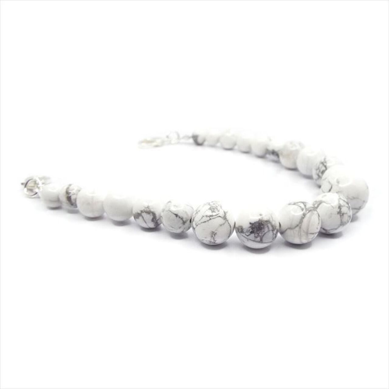 ホワイトターコイズ(ホワイトハウライト/マグネサイト)は、高い浄化作用と鎮静効果を持つパワーストーンで、ストレスを緩和し、心身に平和と安定をもたらすとされています。感情の激昂を鎮め、冷静さと洞察力を高め、目標達成やポジティブな行動力を引き出す効果が期待されています。