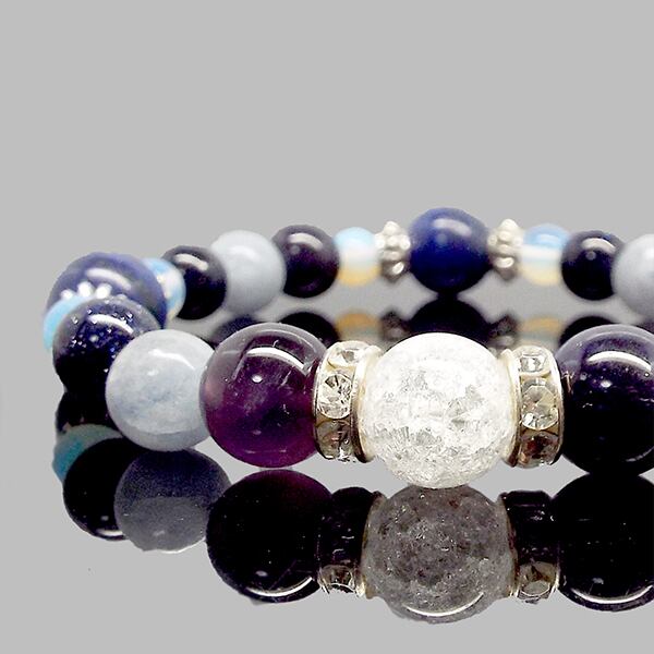 アメジストは心を落ち着け、ストレスを和らげる効果がある天然石として有名です。その美しい紫色は、見る人を惹きつけ、穏やかな気持ちをもたらします。ラピスラズリは、知恵や直感を高めるとされる石で、深い青色が優雅な印象を与えます。アクアマリンは、心に優しさを与え、コミュニケーションを円滑にする力があると言われ、その透明感のある青が爽やさを感じさせます。この3つの石の組み合わせが、心のバランスを整え、あなたの魅力を引き出す特別なブレスレットを作り上げています。